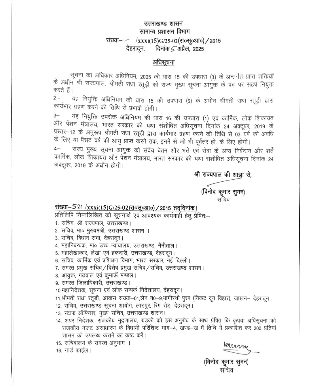 देहरादूनः पूर्व मुख्य सचिव राधा रतूड़ी राज्य की मुख्य सूचना आयुक्त बनी।